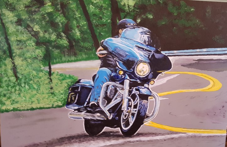 These artworks are inspired by the two Davids, Uhl and Mann. My idols. Uhl is known for oil paintings of vintage Harley Davidson bikes. Mann (1940-2004) was known as “the biker world’s artist-in-residence.”