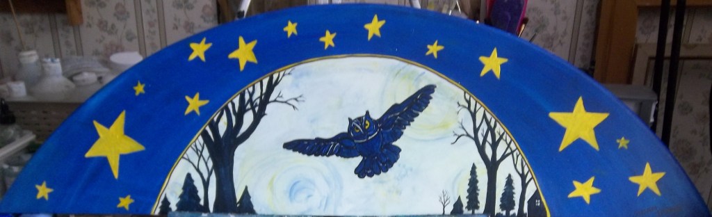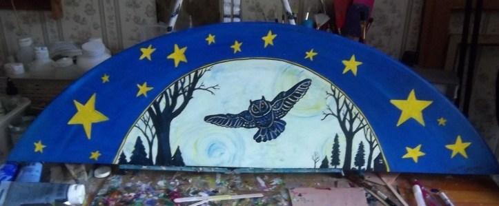 My husband suggested an owl. At this point I did not want to get into changing the moon and stars, so I decided on an owl in flight with a bit of landscape silhouetted at the bottom. I was unsure whether it was finished so asked many of my fellow artists here and in Ottawa what they thought.