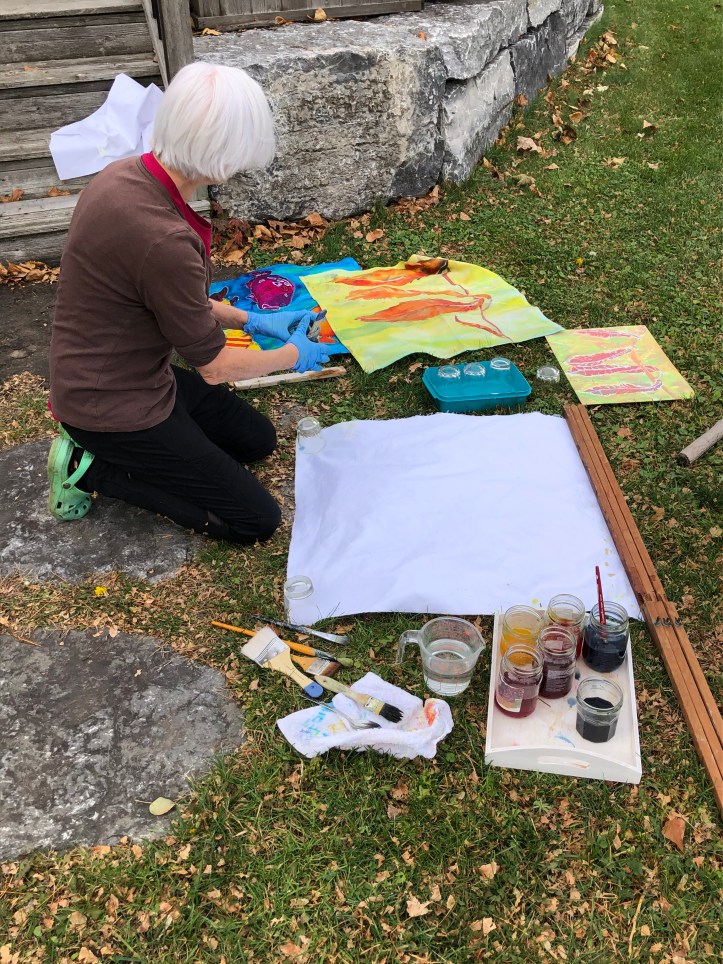 Last fall I decided to pursue a new artistic interest, batik. Starting with books from the library, I experimented with various techniques, with many frustrations. This spring I connected with someone local with batik experience to help me with the next level. Unfortunately Covid struck before we could actually get together. This, together with an increasingly sore right wrist, has presented even more challenges.