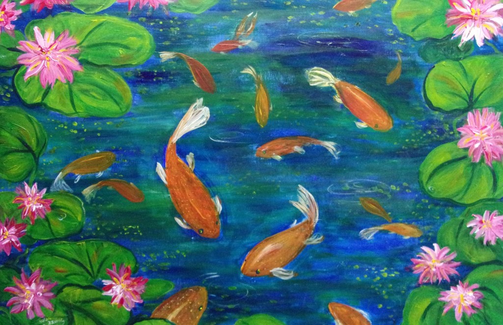 I painted this as a memorial gift for my daughter. Her 15+ year old goldfish, Raven — who was jet black and tiny when we got him, passed away last spring with a number of his offspring from some sort of fish virus.