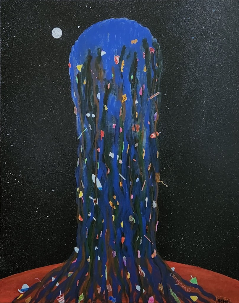 A couple of years ago, when Elon Musk began talking seriously about colonizing Mars, I started this painting.  I didn’t really like it, and so it stood in a pile in my back room until recently when I had decided to paint over it.  Except I didn’t – I really did kind of like it, or at least the idea behind it, so I finished it and will keep it, at least for now.  My name is written along with all the other trash spilling from Earth onto the red planet… a little joke between me and myself.