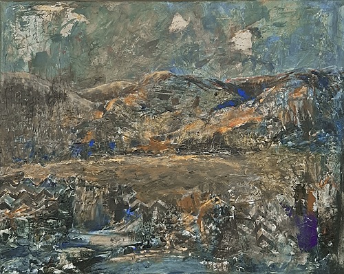I took ripped collage papers I had created myself and using gel medium, pasted them hither thither over the whole canvas. Then I used mars black and zinc (transparent) white and a palette knife and applied without any specific concept in mind other than that I wanted to do an abstract-y landscape. The hope is to cover up much and have collage poke through here and there for layers of interest.