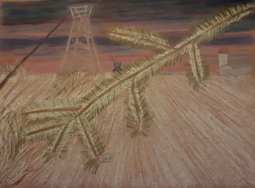 by Kerry Herwynen McIntosh This is a quick acrylic sketch of the  pine tree across the street. The property is for sale now and I know that, when it’s sold, both the abandoned building and that tree will be coming down.