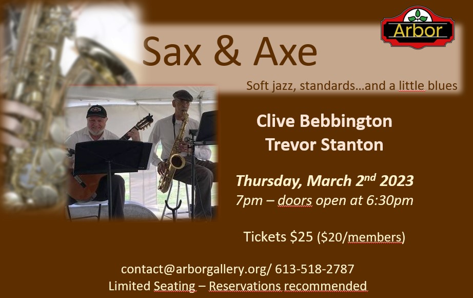 | Sax & Axe, a popular jazz & blues duo composed of Clive Bebbington and Collectif member Trevor Stanton, present an intimate concert at the Arbor Gallery Thursday, March 2nd at 7pm. Tickets are $25 per person ($20 for Arbor members) and can be pre-bought via e-transfer to contact@arborgallery.org – please provide your full name and contact info. as well as the name of the concert/performers, and date. Limited seating. Sax & Axe, duo de musique de jazz et de blues populaire, avec Clive Bebbington et member de Collectif Trevor Stanton présentera un concert intime à la galerie jeudi, 2 mars à 19h. Les billets coûtent 25 $ par personne (20 $ pour members de Gallerie Arbor) et peuvent être achetés d’avance par virement électronique à contact@arborgallery.org – veuillez fournir votre nom et vos coordonnées ainsi que le nom du concert/interprètes, et la date. Places limitées. |