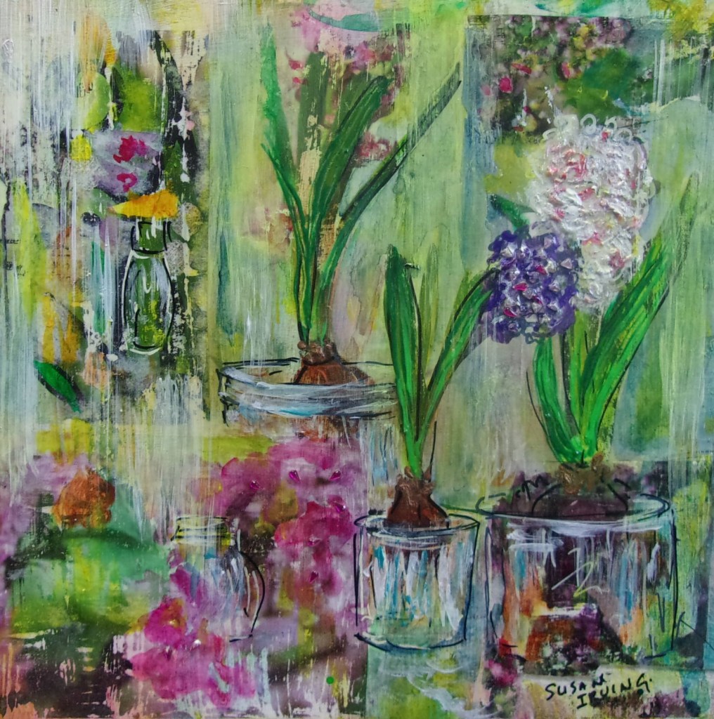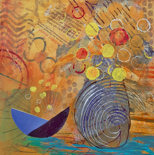 It was a sticky, splashy, learning op interspersed with conversation, laughter, coffee and treats. The leaders had prepped and gessoed the twenty-five 8″-square boards so attendees could dive directly into applying their chosen images.