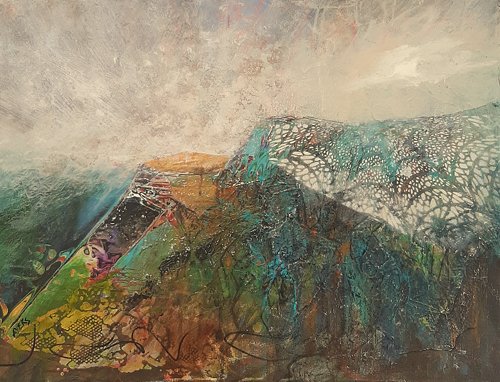 In Soaring, I glued my collage pieces onto the canvas, providing texture as well as colour and shape,  again randomly and without intent. I also used stencils randomly.  I then applied paint, sometimes covering the collage, perhaps rubbing back to allow bits to show through and kept going collaging and painting until I saw that this canvas wanted to be a bird’s eye view of a mountain range.
