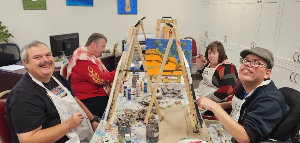 Students from two art classes at Community Living clearly enjoying themselves. Some student works can be seen on the wall and easel.