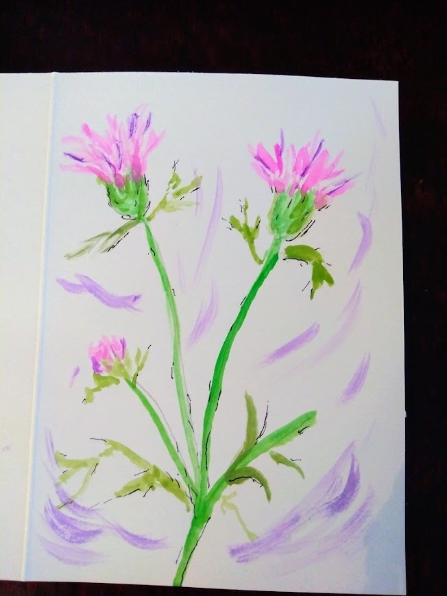 Now my third attempt was somewhat of a mistake. Robin had been talking about painting a thistle but when she started to explain our third attempt, I guess I wasn’t paying attention. She was giving instructions for painting chicory and I, completely on my own, started on the thistle. Halfway through I looked up and saw what she had on the whiteboard and said “oops!” Robin said not to worry, I could do the chicory whilst the rest of the class next did the thistle.