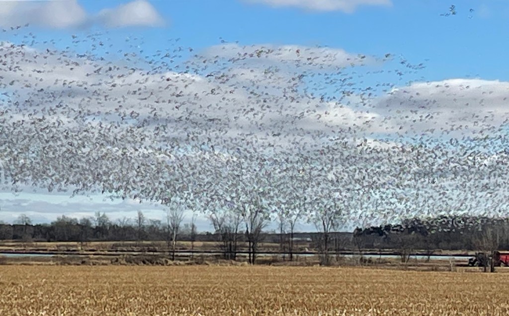 A huge flock of snow geese over a farmer’s field almost blocking the sky.