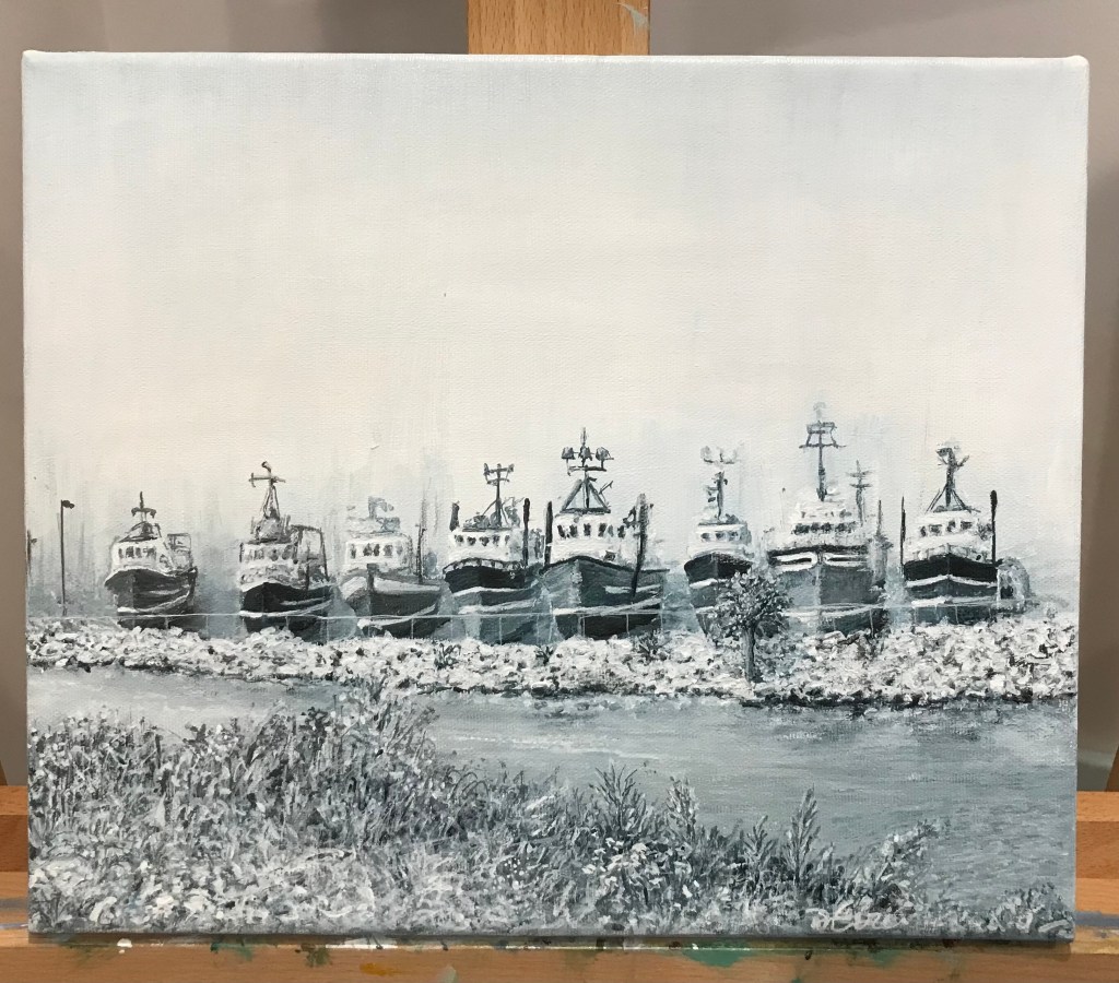 This first represents the fishing boats docked in Shippagan.