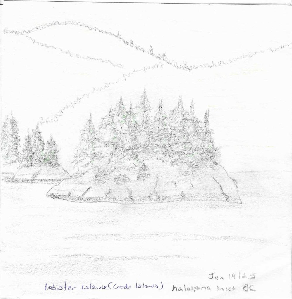 In June we travelled to BC, where we spent a week on a quiet inlet.  We were travelling light so, instead of bringing a bulky sketchbook, I folded a single 18″ x 24″ sheet of sketch paper into 12 panes.  With a few partial cuts to the folds, I had a thin, lightweight, concertina sketchpad with potentially twenty-four 6″ x 6″ sketch surfaces.