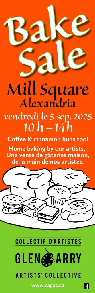 The Collectif Bake Sale will be in Mill Square, FRIDAY, 5 Sept from 10:00 – 14:00. Coffee & cinnamon buns available too. Home baking by our artists. Sales to fund artsy events. Don’t be disappointed – come early!